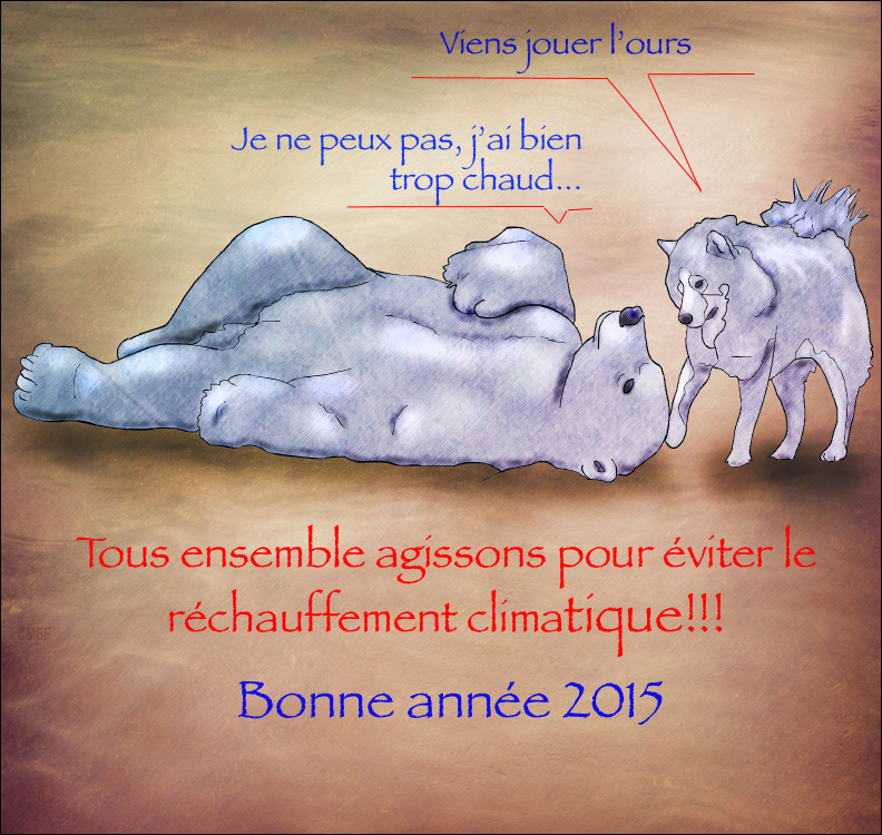 5. En ce début d’année 2015, je souhaite que les humains soient plus sensibilisés aux problèmes dus au réchauffement climatique. Que cette sensibilisation amène tous et chacun à poser des gestes concrets de consommation responsable, à faire des pressions pour que les gouvernements imposent des lois strictes envers l’aide à l’environnement et qu’on soit capables de créer des mesures de soutien aux espèces menacées: parc naturels protégés, reboisement des forêts, arrêt des coupures à blancs dans les forêts tropicales, aide financière aux regroupements travaillant auprès des espèces menacées. Notre environnement est en péril, soyons tous des « médecins » de l’environnement, la faune et la flore pour 2015.
