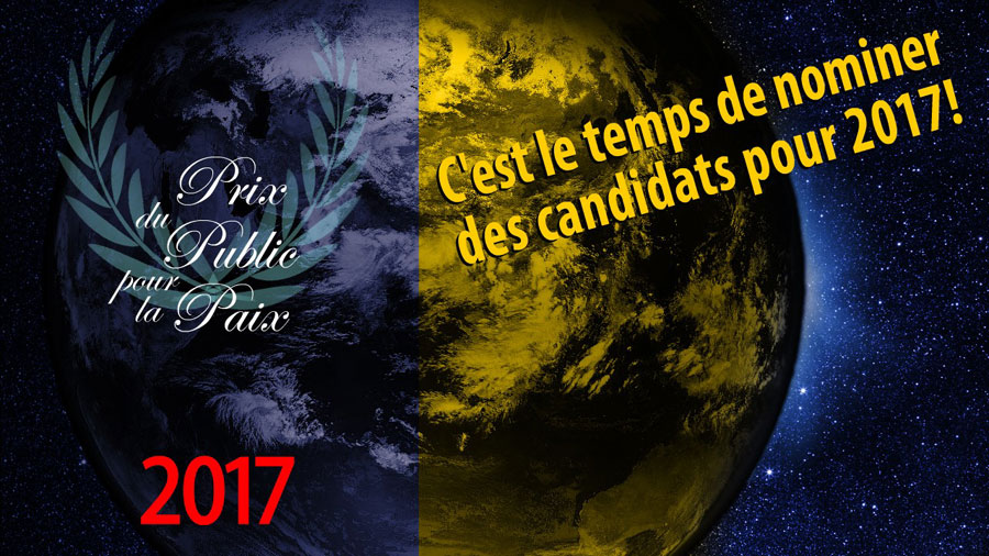 C’EST LE TEMPS DE PROPOSER UNE PERSONNE, UN GROUPE, UNE INITIATIVE OU UNE ŒUVRE AU PRIX DU PUBLIC POUR LA PAIX 2017!