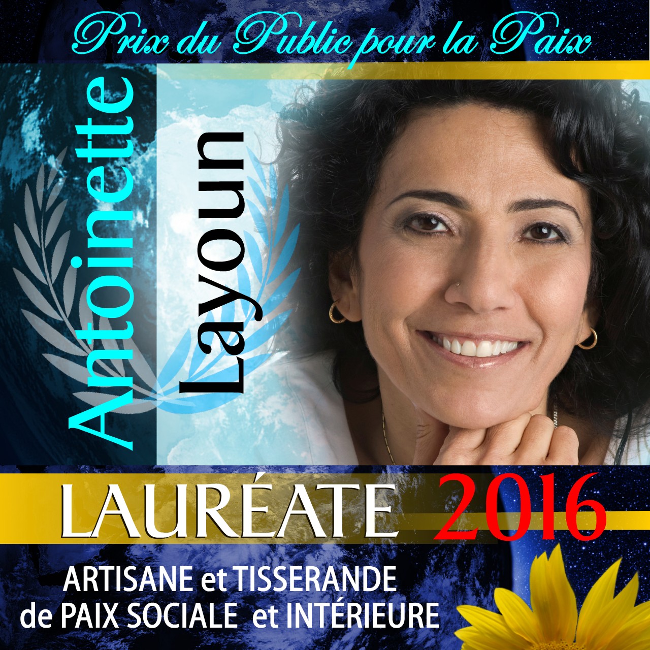 Antoinette LAYOUN, thérapeute et maître de yoga au Québec (Canada), a tiré de son expérience d’enfant-soldat au Liban la force d’aimer et l’art d’enseigner le chemin de la paix en soi pour la transmettre dans une vie aimante et constructive. Les commentaires chaleureux du public lui valent de recevoir le Prix du Public pour la Paix 2016 en qualité d’Artisane et tisserande de paix sociale et intérieure.