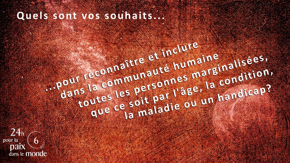 La paix une réalité dynamique qui engage à l’harmonie avec soi, avec les autres respectés et aimés, avec notre monde blessé mais en processus de salut. Il faut nourrir l’espérance et la solidarité.