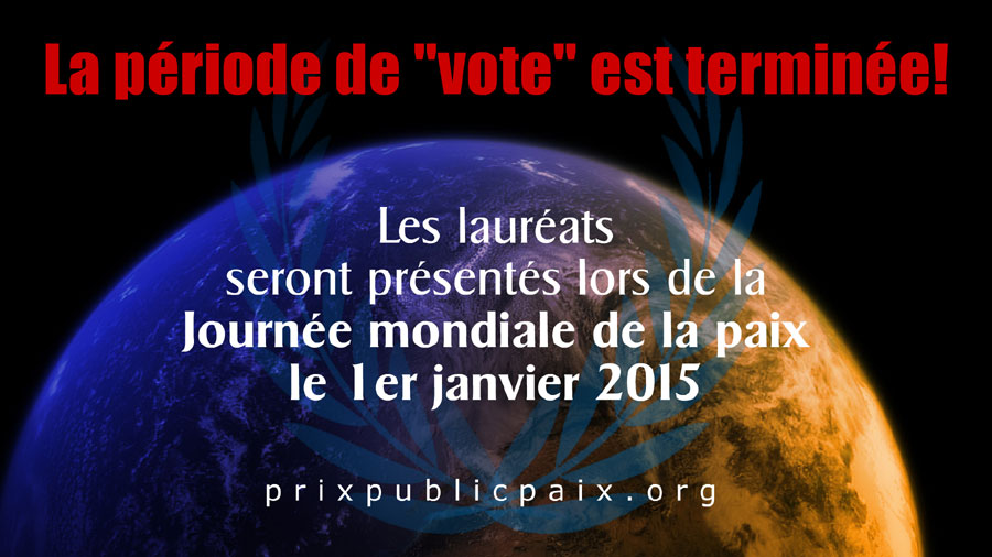 La période de « vote » est maintenant close. Les lauréats seront présentés lors de la Journée mondiale de la paix le 1er janvier 2015, pendant l’événement en ligne des 24 heures pour la paix dans le monde, à compter de minuit UTC.